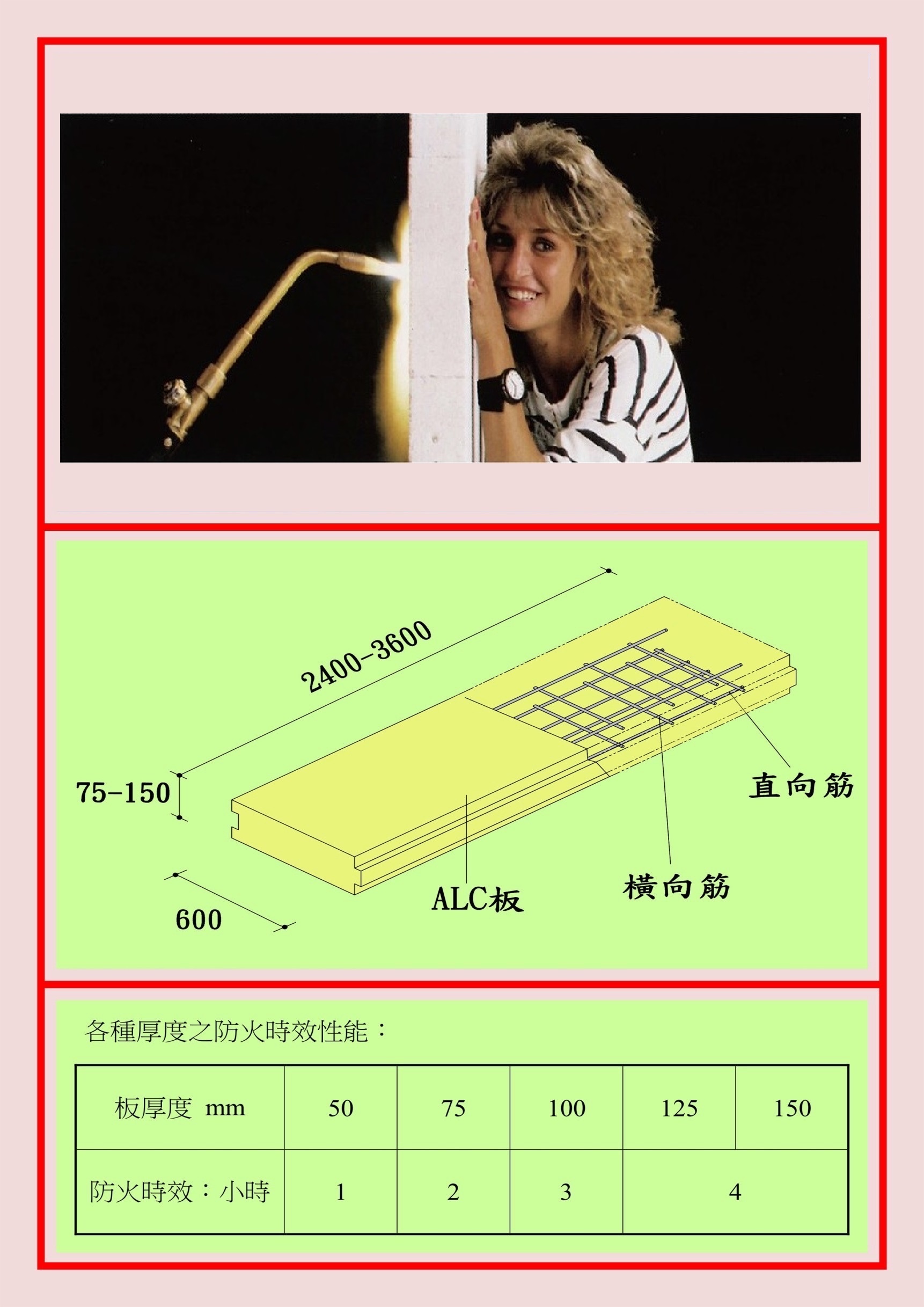 我國ALC板已有30多年的使用經驗,早於民國71年就已經公布ALC板的國家材料標準( CNS-8646 ),以及ALC板的國家檢驗法( CNS-8647 );並且把ALC板列入建築技術規範第71、72條中,屬於達2小時以上防火時效之建材。如今已經深獲國內學術界、營建界和政府單位的高度肯定與認同。