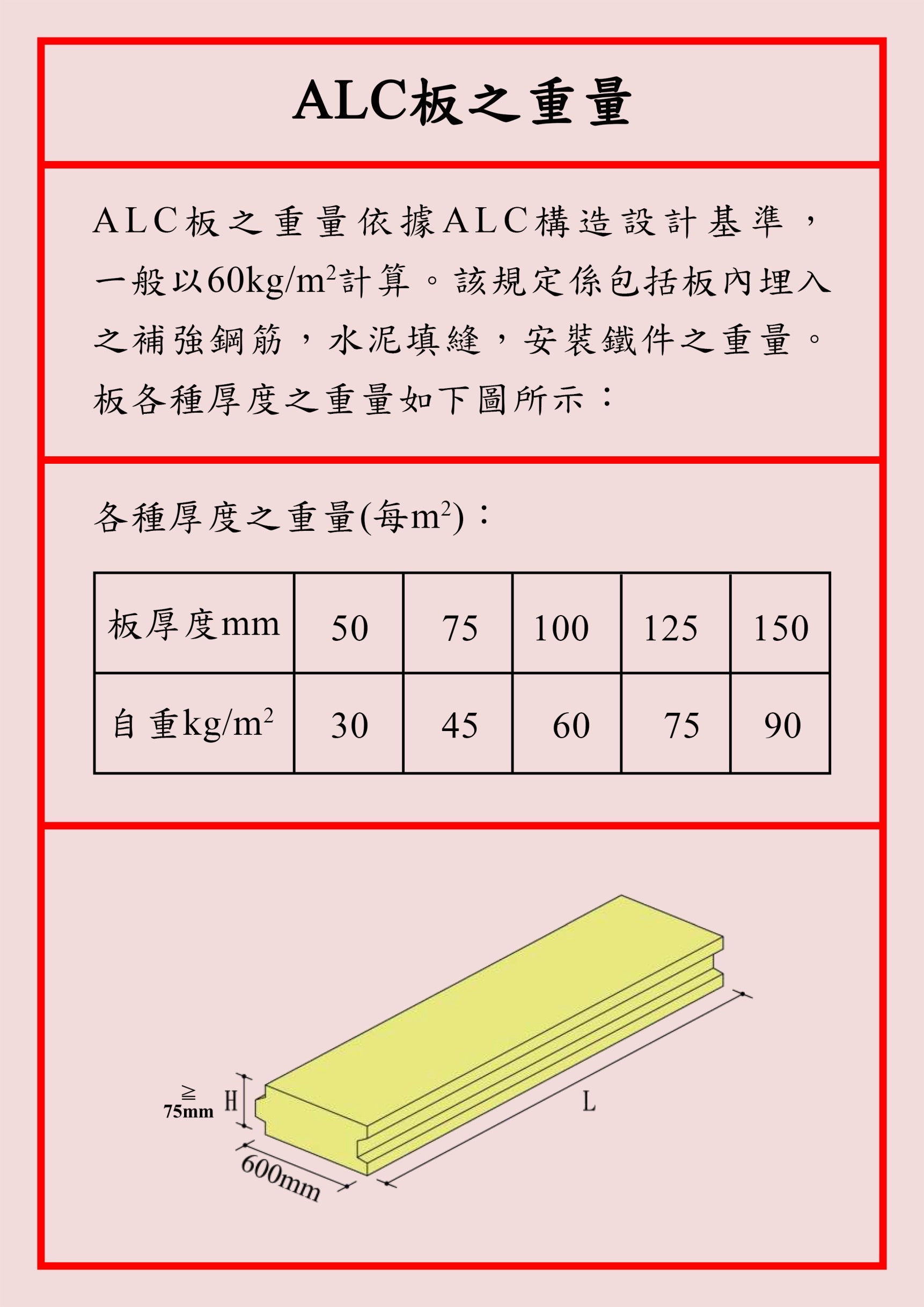 ALC板的優點為質輕性(重量為混凝土之1/5)、導熱率優(為混凝土1/10),兼具隔音、隔熱、耐火、不燃等優良性能,為配合能源政策之有效建材。